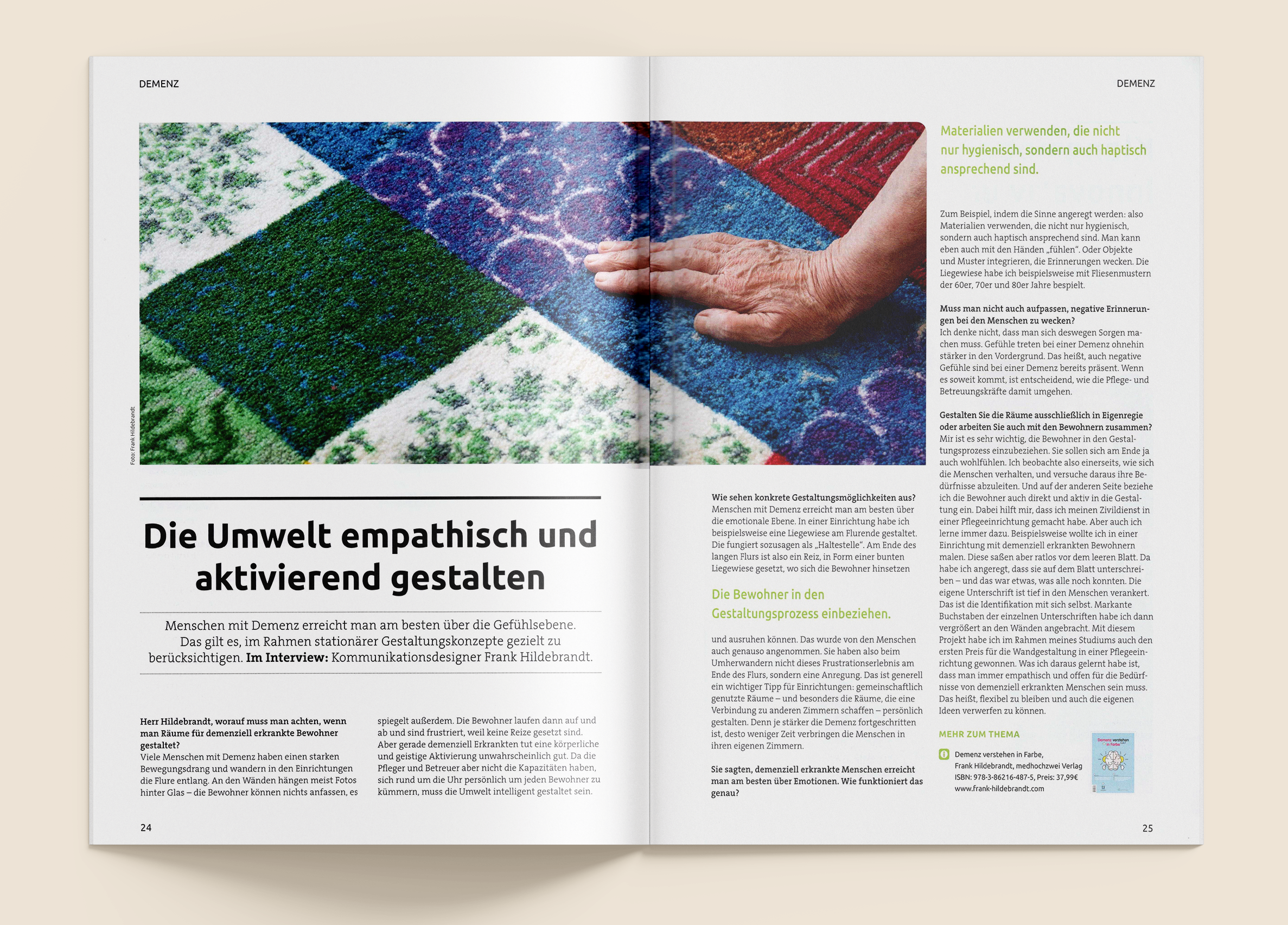 Frank geht mit seinen sehr ansprechenden Gestaltungsentwürfen immer in den Dialog und entwickelt Wünsche aus dem Team gemeinsam weiter. Wir erleben ihn als klaren, kompetenten, zuverlässigen und aufmerksamen Menschen. Frank Hildebrandt schafft mit seiner engagierten Arbeit ein besseres Verständnis für das Krankheitsbild Demenz. Danke!«